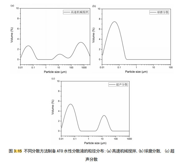 图3.15为不同分散方式的ATO水性分散液的粒径分布图。由图可知,除高速机械搅拌分散效果较差外,球磨分散、超声分散的分散效果均很理想。